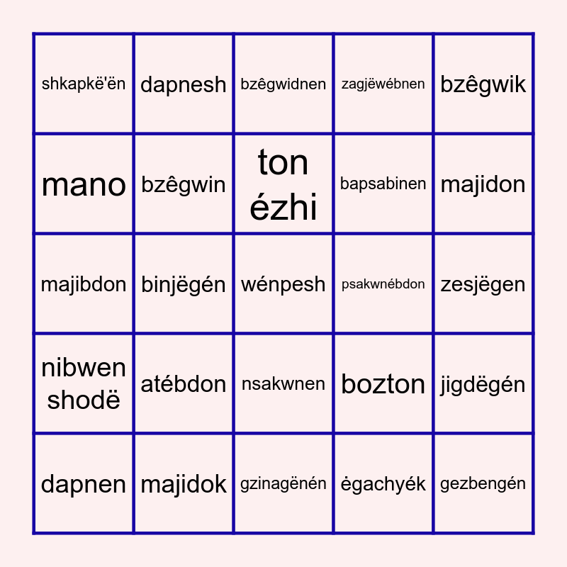 This bingo card has a free space and 34 words: ėgach, ėgachyék, dadokmëbén, nibwen, nibwen shodë, bzêgwin, bzêgwik, dapnen, dapnesh, bgejwébnen, ton ézhi, bzêgwidnen, mishen, bgednen, psakwnébdon, majidon, majidok, majibdon, atébdon, bozton, nsakwnen, bakakwnen, shkapkë'ën, zesjëgen, gzinagënén, gezbengén, zagjëwébnen, wikwbedon, bapsabinen, mano, mnéschëgen, binjëgén, jigdëgén and jigdëgen.