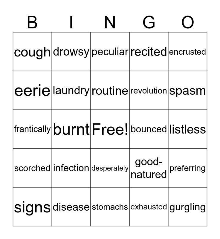 This bingo card has a free space and 24 words: infection, disease, routine, signs, encrusted, cough, eerie, drowsy, bounced, desperately, revolution, frantically, good-natured, preferring, laundry, exhausted, listless, peculiar, spasm, burnt, gurgling, scorched, recited and stomachs.