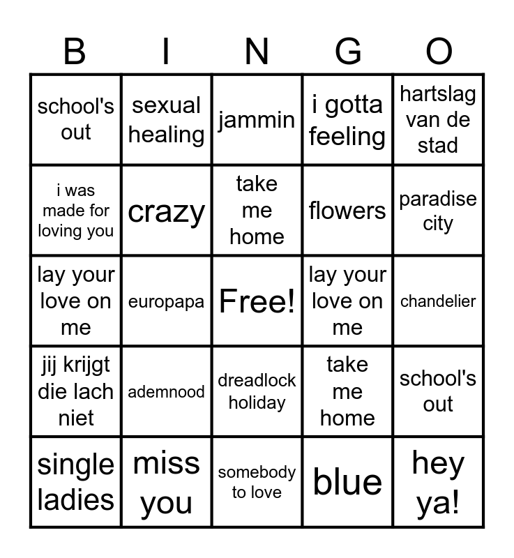 This bingo card has a free space and 29 words: single ladies, disco inferno, europapa, the winner takes it all, school's out, jammin, crazy, ademnood, lay your love on me, miss you, chandelier, hey ya!, somebody to love, blue, paradise city, malle babbe, dreadlock holiday, jij krijgt die lach niet, hartslag van de stad, lay your love on me, take me home, i gotta feeling, flowers, i was made for loving you, i gotta feeling, sexual healing, school's out, take me home and that;s the way.