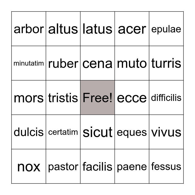 This bingo card has a free space and 30 words: pastor, longus, tristis, propero, arbor, latus, ruber, sicut, ecce, facilis, difficilis, fessus, paene, brevis, turris, matrimonium, eques, dulcis, certatim, epulae, mors, ardeo, altus, muto, minutatim, acer, vivus, nox, cena and canis.