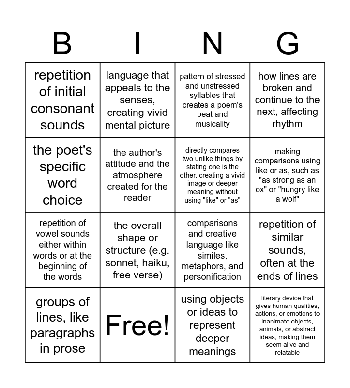 This bingo card has 16 words: Free!, repetition of similar sounds, often at the ends of lines, pattern of stressed and unstressed syllables that creates a poem's beat and musicality, repetition of initial consonant sounds, repetition of vowel sounds either within words or at the beginning of the words, language that appeals to the senses, creating vivid mental picture, comparisons and creative language like similes, metaphors, and personification, using objects or ideas to represent deeper meanings, the poet's specific word choice, the author's attitude and the atmosphere created for the reader, groups of lines, like paragraphs in prose, how lines are broken and continue to the next, affecting rhythm, the overall shape or structure (e.g. sonnet, haiku, free verse), making comparisons using like or as, such as "as strong as an ox" or "hungry like a wolf", directly compares two unlike things by stating one is the other, creating a vivid image or deeper meaning without using "like" or "as" and literary device that gives human qualities, actions, or emotions to inanimate objects, animals, or abstract ideas, making them seem alive and relatable.
