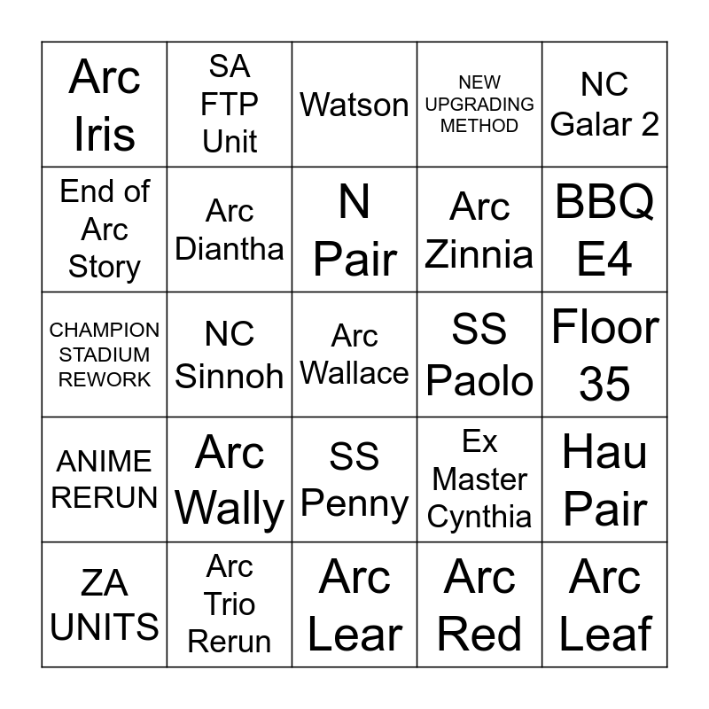 This bingo card has 25 words: Arc Wally, Arc Lear, N Pair, ZA UNITS, NC Galar 2, Arc Iris, End of Arc Story, SA FTP Unit, SS Paolo, SS Penny, Arc Zinnia, CHAMPION STADIUM REWORK, Ex Master Cynthia, Hau Pair, Arc Diantha, Arc Leaf, Floor 35, Watson, BBQ E4, NC Sinnoh, Arc Wallace, Arc Trio Rerun, ANIME RERUN, NEW UPGRADING METHOD and Arc Red.