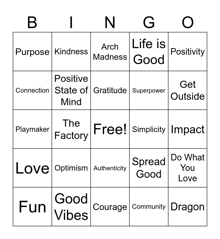 This bingo card has a free space and 24 words: Optimism, Good Vibes, Gratitude, Fun, Positivity, Purpose, Connection, Kindness, Simplicity, Authenticity, Superpower, Playmaker, Spread Good, Do What You Love, Positive State of Mind, Community, Impact, Arch Madness, Get Outside, The Factory, Dragon, Love, Life is Good and Courage.