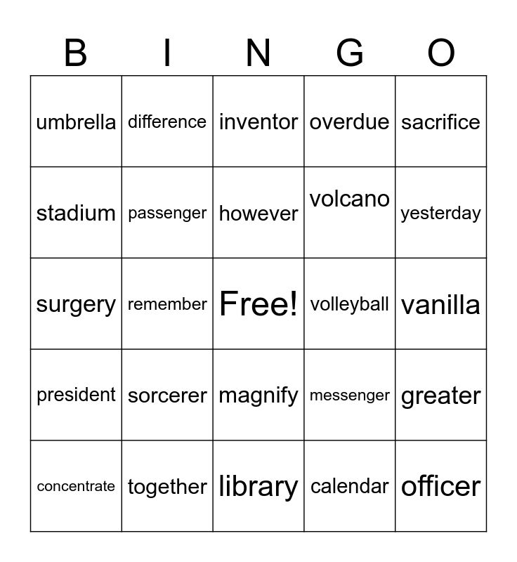 This bingo card has a free space and 34 words: basketball, calendar, substitute, qualify, president, passenger, sacrifice, concentrate, difference, exercise, however, inventor, celery, triangle, volleyball, yesterday, together, surgery, sorcerer, messenger, magnify, sincerely, umbrella, vanilla, library, officer, overdue, porcupine, volcano, stadium, scientist, remember, greater and season.