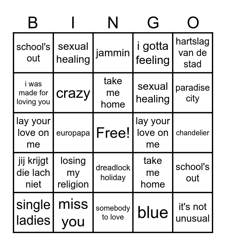 This bingo card has a free space and 29 words: single ladies, disco inferno, europapa, the winner takes it all, school's out, jammin, crazy, losing my religion, lay your love on me, miss you, chandelier, it's not unusual, somebody to love, blue, paradise city, malle babbe, dreadlock holiday, jij krijgt die lach niet, hartslag van de stad, lay your love on me, take me home, i gotta feeling, sexual healing, i was made for loving you, i gotta feeling, sexual healing, school's out, take me home and that;s the way.