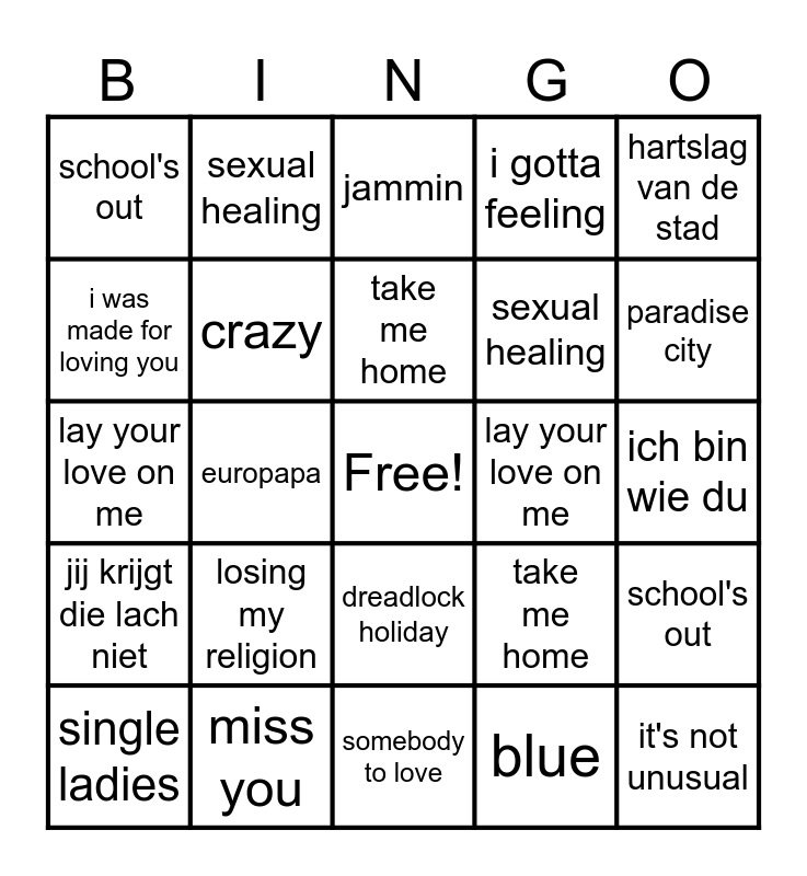 This bingo card has a free space and 29 words: single ladies, hier mag alles, europapa, the winner takes it all, school's out, jammin, crazy, losing my religion, lay your love on me, miss you, ich bin wie du, it's not unusual, somebody to love, blue, paradise city, malle babbe, dreadlock holiday, jij krijgt die lach niet, hartslag van de stad, lay your love on me, take me home, du, sexual healing, i was made for loving you, i gotta feeling, sexual healing, school's out, take me home and that;s the way.