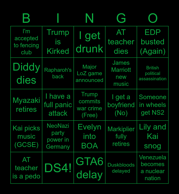 This bingo card has a free space and 24 words: NeoNazi party power in Germany, DS4!, Major LoZ game announced, AT teacher is a pedo, EDP busted (Again), I'm accepted to fencing club, Diddy dies, Trump is Kirked, I get a boyfriend (No), Evelyn into BOA, James Marriott new music, Myazaki retires, Markiplier fully retires, Lily and Kai snog, Rapharoh's back, Duskbloods delayed, Someone in wheels get NS2, I get drunk, British political assassination, I have a full panic attack, Venezuela becomes a nuclear nation, Kai picks music (GCSE), AT teacher dies and GTA6 delay.