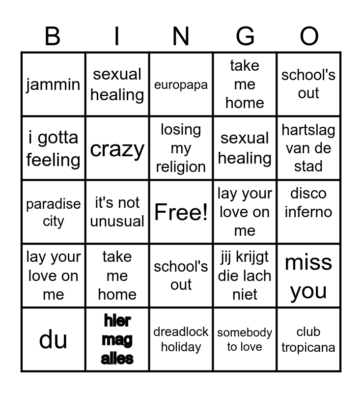 This bingo card has a free space and 29 words: single ladies, hier mag alles, europapa, the winner takes it all, school's out, jammin, crazy, losing my religion, lay your love on me, miss you, du, it's not unusual, somebody to love, club tropicana, paradise city, malle babbe, dreadlock holiday, jij krijgt die lach niet, hartslag van de stad, lay your love on me, take me home, bad romance, sexual healing, disco inferno, i gotta feeling, sexual healing, school's out, take me home and that;s the way.