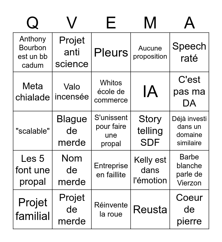 This bingo card has 25 words: Nom de merde, Réinvente la roue, Whitos école de commerce, Projet familial, Speech raté, Anthony Bourbon est un bb cadum, Meta chialade, Projet anti science, Story telling SDF, Entreprise en faillite, IA, "scalable", Kelly est dans l'émotion, Barbe blanche parle de Vierzon, Valo incensée, Coeur de pierre, Déjà investi dans un domaine similaire, Pleurs, C'est pas ma DA, Blague de merde, S'unissent pour faire une propal, Projet de merde, Les 5 font une propal, Aucune proposition and Reusta.