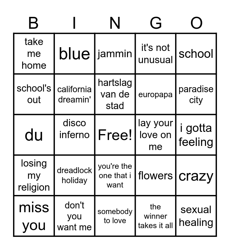 This bingo card has a free space and 28 words: crazy, jij krijgt die lach, europapa, the winner takes it all, school's out, jammin, blue, losing my religion, lay your love on me, miss you, du, it's not unusual, don't you want me, somebody to love, paradise city, stumblin in, dreadlock holiday, california dreamin', hartslag van de stad, you're the one that i want, take me home, bad romance, sexual healing, disco inferno, i gotta feeling, flowers, school and paradise city.