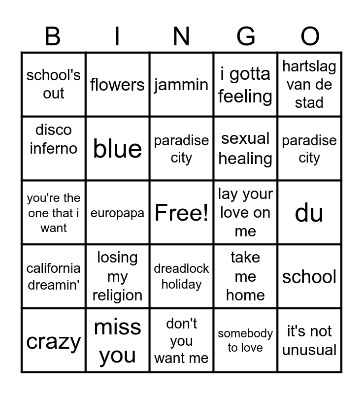 This bingo card has a free space and 29 words: crazy, jij krijgt die lach, europapa, the winner takes it all, school's out, jammin, blue, losing my religion, lay your love on me, miss you, du, it's not unusual, don't you want me, somebody to love, paradise city, stumblin in, dreadlock holiday, california dreamin', hartslag van de stad, you're the one that i want, take me home, bad romance, sexual healing, disco inferno, i gotta feeling, flowers, school, paradise city and ich bin wie du.
