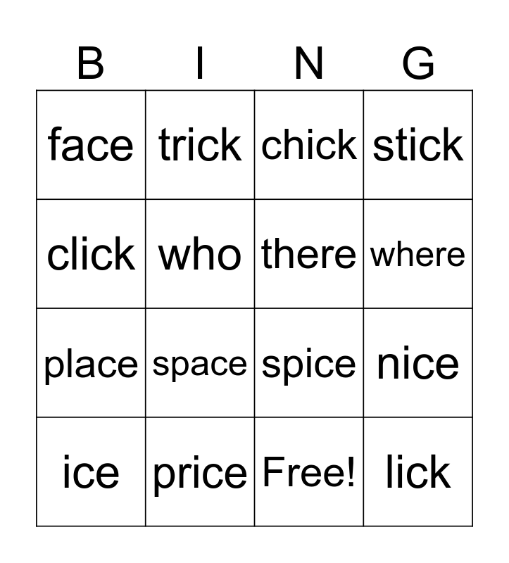 This bingo card has 17 words: Free!, ice, chick, face, space, stick, nice, there, where, who, price, spice, click, trick, place, trace and lick.