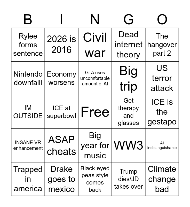 This bingo card has a free space and 24 words: ASAP cheats, Drake goes to mexico, GTA uses uncomfortable amount of AI, Trapped in america, The hangover part 2, Rylee forms sentence, Nintendo downfalll, 2026 is 2016, Get therapy and glasses, Big year for music, Big trip, IM OUTSIDE, WW3, AI indistinguishable, Economy worsens, Trump dies/JD takes over, ICE is the gestapo, Civil war, US terror attack, ICE at superbowl, Climate change bad, INSANE VR enhancement, Dead internet theory and Black eyed peas style comes back.