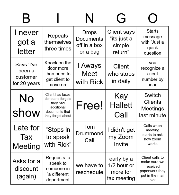 This bingo card has a free space and 24 words: "Stops in to speak with Rick", Requests to speak to someone in 'a different department, I Aways Meet with Rick, Asks for a discount (again), Starts message with 'Just a quick question, I never got a letter, Says 'I've been a customer for 20 years, Repeats themselves three times, Kay Hallett Call, Tom Drummond Call, Client who stops in daily, No show, I didn't get my Zoom Invite, Calls when meeting starts to ask how zoom works, Knock on the door more than once to get client to move on., early by a 1/2 hour or more for tax meeting, Switch Clients Meetings last minute, Drops Documents off in a box or a bag, you recognize a client number by heart, Client has taxes done and forgets they had additional documents that they forgot about, Client calls to make sure we received paperwork they put in the mail slot, Late for Tax Meeting, Client says "its just a simple return" and we have to reschedule.