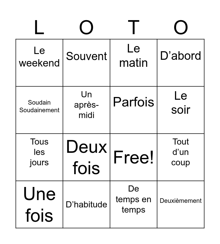 This bingo card has 21 words: D’habitude, En générale, Souvent, Toujours, De temps en temps, Parfois, Le weekend, Le matin, Free!, Le soir, Tous les jours, D’abord, Deuxièmement, Un matin, Un après-midi, Puis, ensuite, Une fois, Deux fois, Soudain Soudainement, Tout d’un coup and Efin, Finalement.