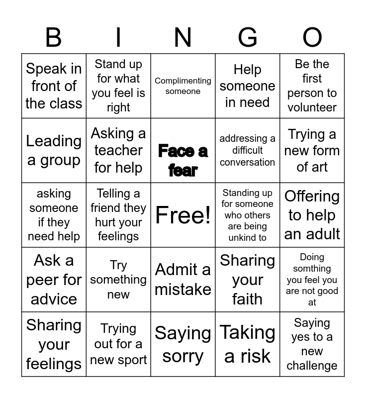 This bingo card has a free space and 24 words: Try something new, Trying out for a new sport, Face a fear, Sharing your feelings, Be the first person to volunteer, Speak in front of the class, Leading a group, Stand up for what you feel is right, Standing up for someone who others are being unkind to, Admit a mistake, addressing a difficult conversation, asking someone if they need help, Sharing your faith, Doing somthing you feel you are not good at, Asking a teacher for help, Taking a risk, Offering to help an adult, Complimenting someone, Trying a new form of art, Telling a friend they hurt your feelings, Saying yes to a new challenge, Ask a peer for advice, Help someone in need and Saying sorry.