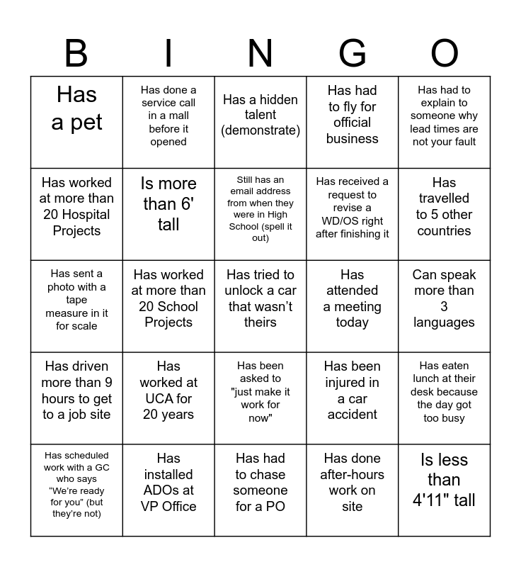 This bingo card has 25 words: Has worked at UCA for 20 years, Has had to chase someone for a PO, Still has an email address from when they were in High School (spell it out), Has scheduled work with a GC who says “We’re ready for you” (but they’re not), Has had to explain to someone why lead times are not your fault, Has a pet, Has worked at more than 20 Hospital Projects, Has done a service call in a mall before it opened, Has attended a meeting today, Has been asked to "just make it work for now", Has received a request to revise a WD/OS right after finishing it, Has sent a photo with a tape measure in it for scale, Has been injured in a car accident, Has eaten lunch at their desk because the day got too busy, Is more than 6' tall, Is less than 4'11" tall, Can speak more than 3 languages, Has a hidden talent (demonstrate), Has travelled to 5 other countries, Has worked at more than 20 School Projects, Has tried to unlock a car that wasn’t theirs, Has installed ADOs at VP Office, Has driven more than 9 hours to get to a job site, Has had to fly for official business and Has done after-hours work on site.