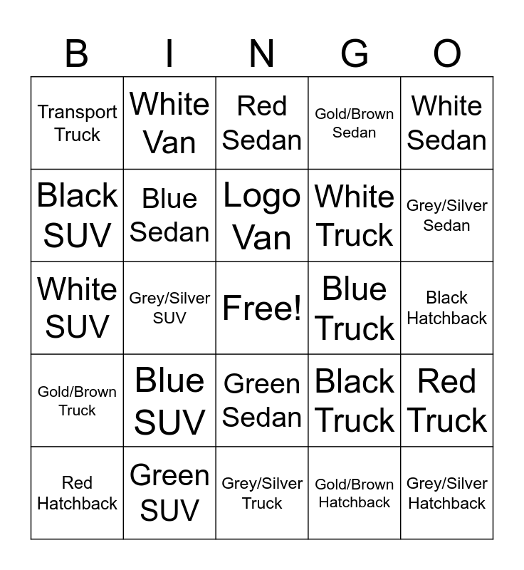 This bingo card has a free space and 25 words: Blue SUV, Grey/Silver Truck, Logo Van, Red Hatchback, White Sedan, Transport Truck, Black SUV, White Van, Blue Truck, Green Sedan, White Truck, White SUV, Black Truck, Red Truck, Blue Sedan, Blue Hatchback, Black Hatchback, Red Sedan, Grey/Silver Sedan, Grey/Silver SUV, Grey/Silver Hatchback, Green SUV, Gold/Brown Truck, Gold/Brown Sedan and Gold/Brown Hatchback.