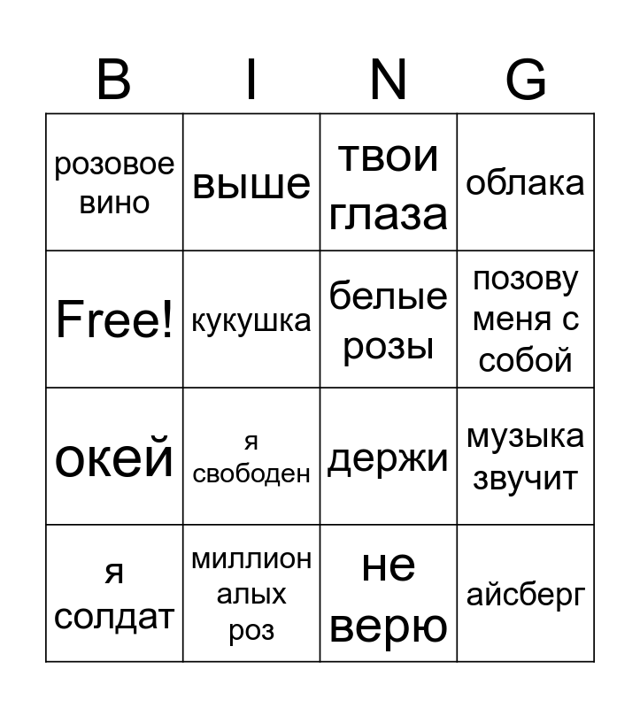 This bingo card has 16 words: миллион алых роз, музыка звучит, твои глаза, розовое вино, окей, выше, держи, не верю, Free!, кукушка, я солдат, облака, я свободен, позову меня с собой, белые розы and айсберг.