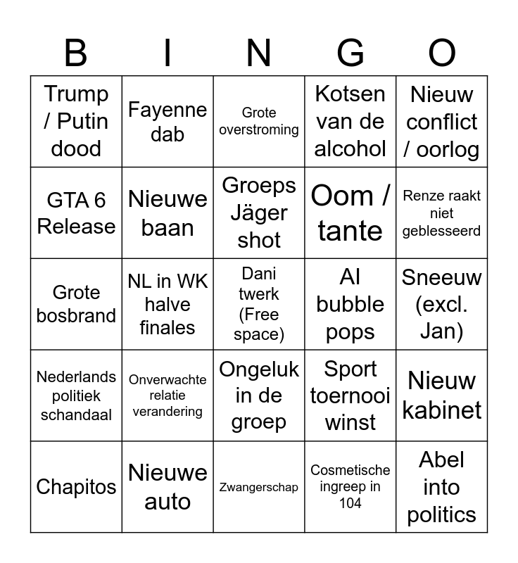 This bingo card has a free space and 24 words: Onverwachte relatie verandering, Nieuwe auto, Groeps Jäger shot, Chapitos, Nieuw conflict / oorlog, Trump / Putin dood, GTA 6 Release, Fayenne dab, AI bubble pops, Ongeluk in de groep, Oom / tante, Grote bosbrand, Sport toernooi winst, Nieuw kabinet, Nieuwe baan, Cosmetische ingreep in 104, Sneeuw (excl. Jan), Grote overstroming, Renze raakt niet geblesseerd, NL in WK halve finales, Abel into politics, Nederlands politiek schandaal, Kotsen van de alcohol and Zwangerschap.