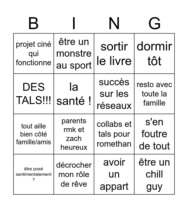 This bingo card has 16 words: décrocher mon rôle de rêve, s'en foutre de tout, sortir le livre, projet ciné qui fonctionne, tout aille bien côté famille/amis, être un monstre au sport, collabs et tals pour romethan, avoir un appart, DES TALS!!!, la santé !, être posé sentimentalement ?, dormir tôt, parents rmk et zach heureux, resto avec toute la famille, succès sur les réseaux and être un chill guy.