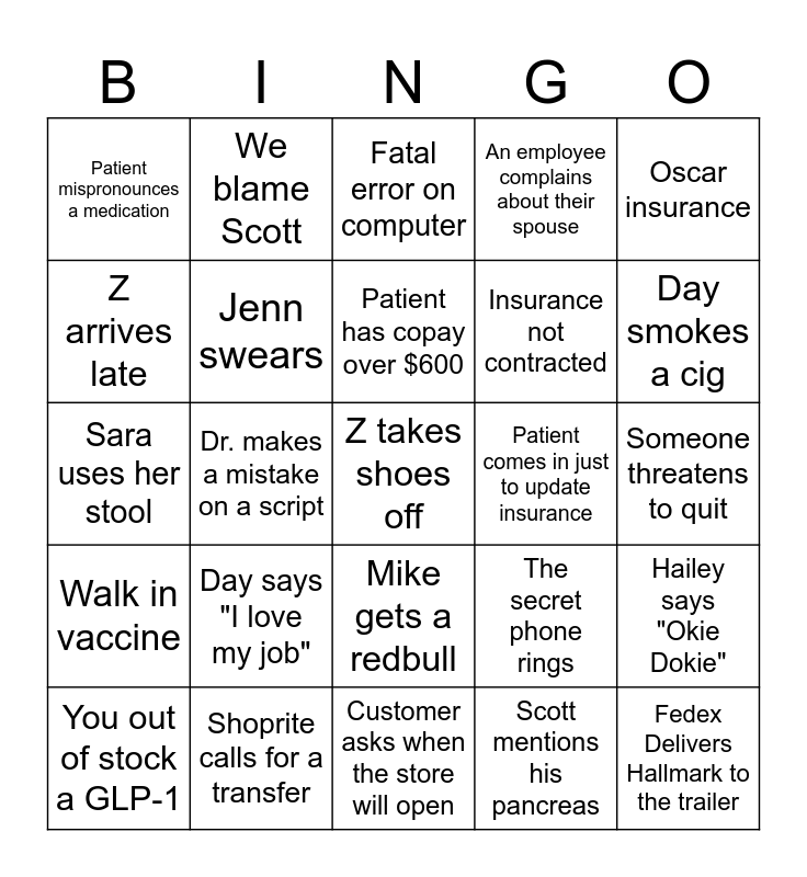 This bingo card has a free space and 49 words: Computers Crash, Fedex Delivers Hallmark to the trailer, Someone gets yelled at over a copay, Customer asks when the store will open, Day says "I love my job", Store date gets pushed back, We blame Scott, Kaitlyn says "Oops!", Z arrives late, Kim complains about something, Jenn swears, An employee complains about their spouse, Hailey says "Okie Dokie", The secret phone rings, Express pay doesn't work, Sara swears, Patient has copay over $600, Patient comes in just to update insurance, Patient asks if Adderall is in stock, Oscar insurance, Dr. makes a mistake on a script, Scott mentions his pancreas, Patient mispronounces a medication, Insurance not contracted, Mike mispronounces a medication, Day smokes a cig, You out of stock a GLP-1, Jenn forgets her tea, Mike gets a redbull, Walk in vaccine, Customer tries to get in while we are closed for lunch, Someone is waiting at the door before we open, Something doesn't come in shipment that was supposed to, A piece of technology stops working, Shoprite calls for a transfer, A customer destroys the bathroom, Kim threatens to break something, Another store calls with a question, Someone threatens to quit, Hailey plays with a cube, Customer is at wrong pharmacy, CVS calls for a transfer, Something is found in the wrong spot, Walmart calls for a transfer, Sara uses her stool, Fatal error on computer, Day sings a song, Someone's medication is ready at Whitehouse and Someone's medication is ready at Flemington.