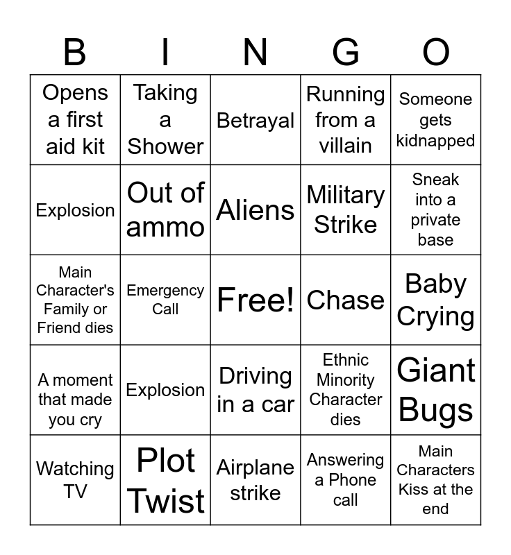 This bingo card has a free space and 24 words: Explosion, Plot Twist, Aliens, Watching TV, Someone gets kidnapped, Opens a first aid kit, Explosion, Taking a Shower, Chase, Driving in a car, Military Strike, Main Character's Family or Friend dies, Ethnic Minority Character dies, Giant Bugs, Out of ammo, Answering a Phone call, Baby Crying, Betrayal, Sneak into a private base, Emergency Call, Main Characters Kiss at the end, A moment that made you cry, Running from a villain and Airplane strike.