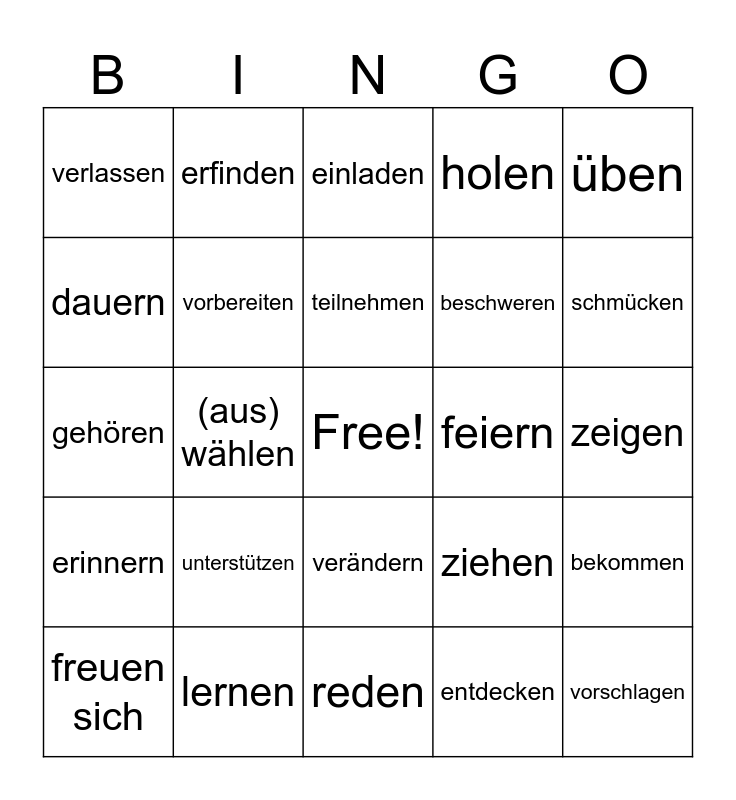 This bingo card has a free space and 28 words: bekommen, besuchen, beschweren, entdecken, dauern, einladen, erfinden, erinnern, feiern, freuen sich, gehören, holen, lernen, reden, schmücken, streiten, unterstützen, vorbereiten, teilnehmen, verändern, verlassen, verstecken, vorschlagen, (aus) wählen, zeigen, ziehen, üben and suchen.