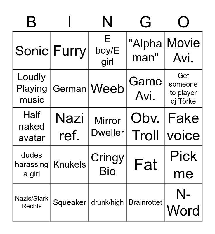 This bingo card has a free space and 24 words: Knukels, Squeaker, Weeb, Nazis/Stark Rechts, Movie Avi., Sonic, Loudly Playing music, Furry, Obv. Troll, Cringy Bio, Game Avi., Half naked avatar, Fat, Pick me, German, Brainrottet, Fake voice, E boy/E girl, Get someone to player dj Törke, Nazi ref., N-Word, dudes harassing a girl, "Alpha man" and drunk/high.