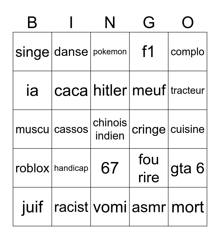 This bingo card has a free space and 24 words: handicap, racist, hitler, juif, complo, singe, ia, danse, cringe, 67, meuf, muscu, fou rire, gta 6, caca, asmr, cuisine, pokemon, tracteur, cassos, mort, roblox, f1 and vomi.