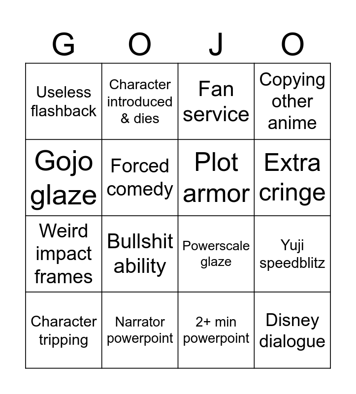 This bingo card has 16 words: Narrator powerpoint, Yuji speedblitz, Fan service, Useless flashback, Weird impact frames, Character introduced & dies, Powerscale glaze, 2+ min powerpoint, Gojo glaze, Forced comedy, Character tripping, Copying other anime, Bullshit ability, Extra cringe, Plot armor and Disney dialogue.