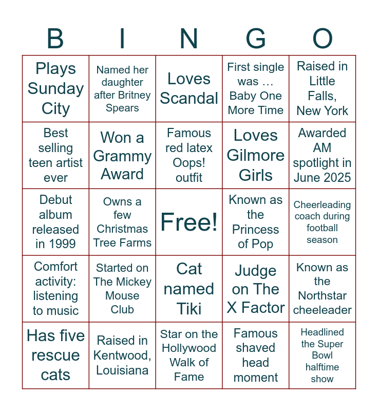 This bingo card has a free space and 24 words: Started on The Mickey Mouse Club, Raised in Kentwood, Louisiana, Famous red latex Oops! outfit, Has five rescue cats, Raised in Little Falls, New York, Plays Sunday City, Best selling teen artist ever, Named her daughter after Britney Spears, Known as the Princess of Pop, Cat named Tiki, Loves Gilmore Girls, Debut album released in 1999, Judge on The X Factor, Known as the Northstar cheeleader, Won a Grammy Award, Famous shaved head moment, Cheerleading coach during football season, Loves Scandal, Awarded AM spotlight in June 2025, Owns a few Christmas Tree Farms, Headlined the Super Bowl halftime show, Comfort activity: listening to music, First single was …Baby One More Time and Star on the Hollywood Walk of Fame.
