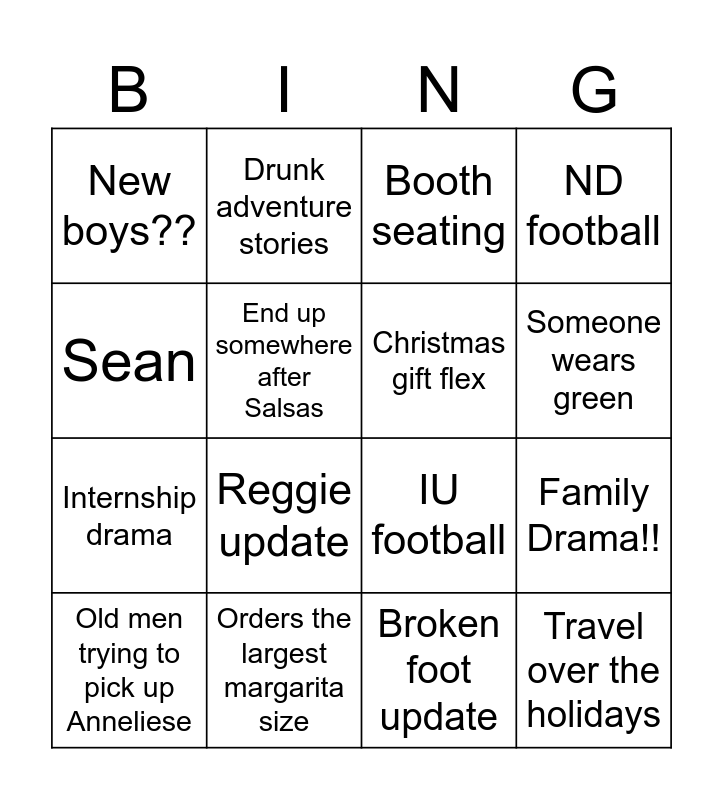 This bingo card has 16 words: Orders the largest margarita size, Family Drama!!, Booth seating, New boys??, Internship drama, Drunk adventure stories, IU football, Broken foot update, Sean, End up somewhere after Salsas, Old men trying to pick up Anneliese, ND football, Reggie update, Someone wears green, Christmas gift flex and Travel over the holidays.