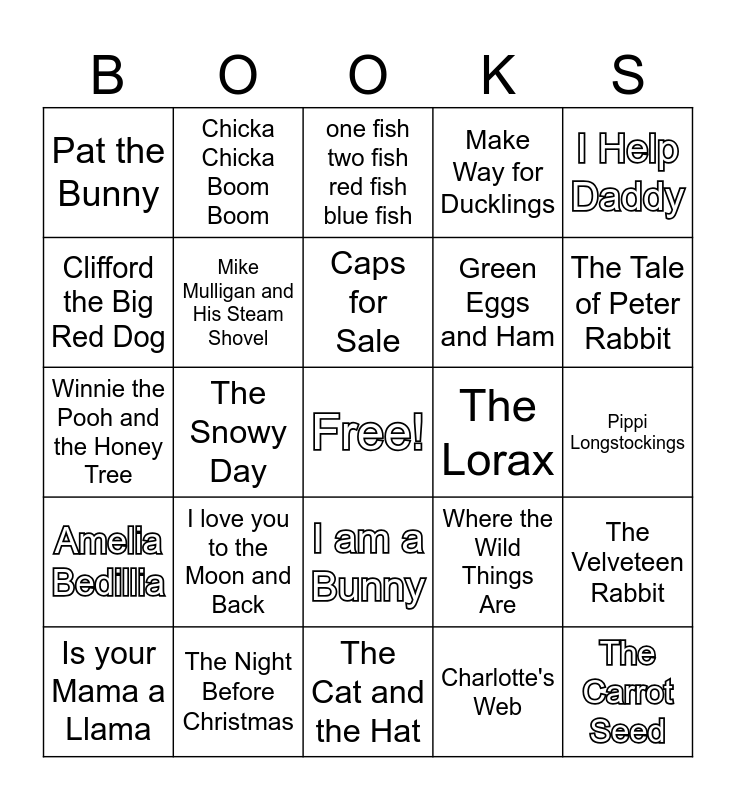This bingo card has a free space and 44 words: The Giving Tree, The Carrot Seed, The Little Engine that Could, Is your Mama a Llama, Brown Bear Brown Bear What do You See, Charlotte's Web, one fish two fish red fish blue fish, Guess How Much I Love You, I Help Daddy, The Night Before Christmas, Make Way for Ducklings, The Lorax, I am a Bunny, I love you to the Moon and Back, Goodnight Moon, The Cat and the Hat, If you Give a Mouse a Cookie, Winnie the Pooh and the Honey Tree, Alexander and the Terrible, Horrible, No Good, Very Bad Day, The Tale of Peter Rabbit, Chicka Chicka Boom Boom, Moo, Baa, La La La, Dragons Love Tacos, Pat the Bunny, The Very Hungry Caterpillar, Pippi Longstockings, Curious George, The Pokey Little Puppy, Where the Wild Things Are, Amelia Bedillia, Harold and the Purple Crayon, The Velveteen Rabbit, The Little Prince, Stone Soup, The Snowy Day, Grimm's Fairy Tales, The Rainbow Fish, Story of Ferdinand, Caps for Sale, Clifford the Big Red Dog, Green Eggs and Ham, Are you My Mother, Mike Mulligan and His Steam Shovel and Corduroy.