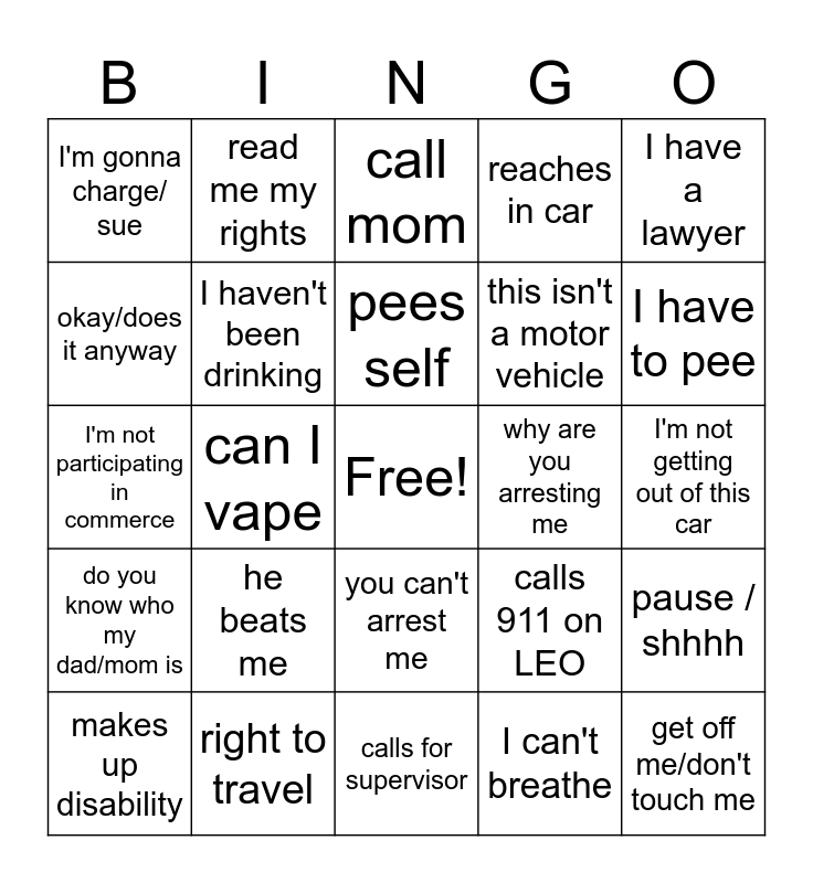 This bingo card has a free space and 29 words: makes up disability, not my drugs, can I vape, can I help you, I'm gonna charge/ sue, call mom, I haven't been drinking, he beats me, why are you arresting me, right to travel, I'm not getting out of this car, get off me/don't touch me, calls for supervisor, I can't breathe, I have to pee, what is the emergency, you can't arrest me, do you know who my dad/mom is, I have a lawyer, I'm not participating in commerce, calls 911 on LEO, I know my rights, this isn't a motor vehicle, okay/does it anyway, reaches in car, read me my rights, pause / shhhh, pees self and please don't do this.