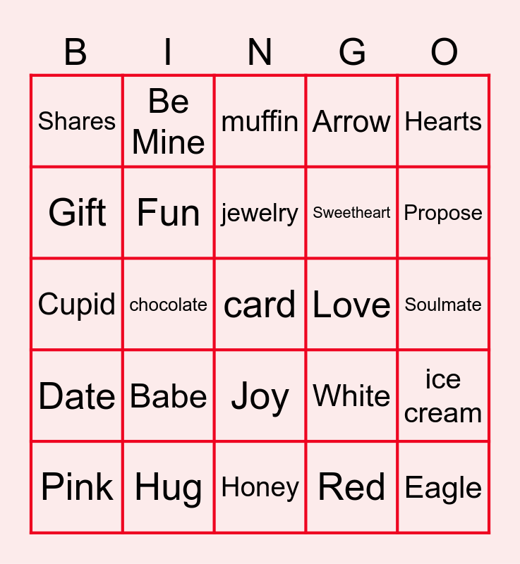 This bingo card has 35 words: February, Flowers, Cherish, Fun, Joy, Arrow, Gift, Rose, jewelry, Candy, Cupid, Hearts, Free!, romantic comedies, Shares, Love, Red, chocolate, Date, card, White, Pink, ice cream, Hug, muffin, Propose, Eagle, Stuff Toy, Sweetheart, Soulmate, Doves, Honey, Babe, Be Mine and I love You.