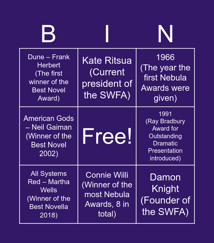 This bingo card has a free space and 15 words: SWFA (Science fiction and Fantasy Writers of Association), Science Fiction and Fantasy (Required genre to be nominated), 1966 (The year the first Nebula Awards were given), Dune – Frank Herbert (The first winner of the Best Novel Award), Connie Willi (Winner of the most Nebula Awards, 8 in total), Damon Knight (Founder of the SWFA), Andre Norton Award (Category: middle grade and young adult fiction), 1970(First Nebula Award for Best Short Story given), 1991 (Ray Bradbury Award for Outstanding Dramatic Presentation introduced), The Left Hand of Darkness – Ursula K. Le Guin (Winner of the Best Novel 1969), A Song for a New Day – Sarah Pinsker (Winner of the Best Novel 2019), American Gods – Neil Gaiman (Winner of the Best Novel 2002), All Systems Red – Martha Wells (Winner of the Best Novella 2018), Kate Ritsua (Current president of the SWFA) and Annihilation – Jeff VanderMeer (Winner of the Best Novel 2014).