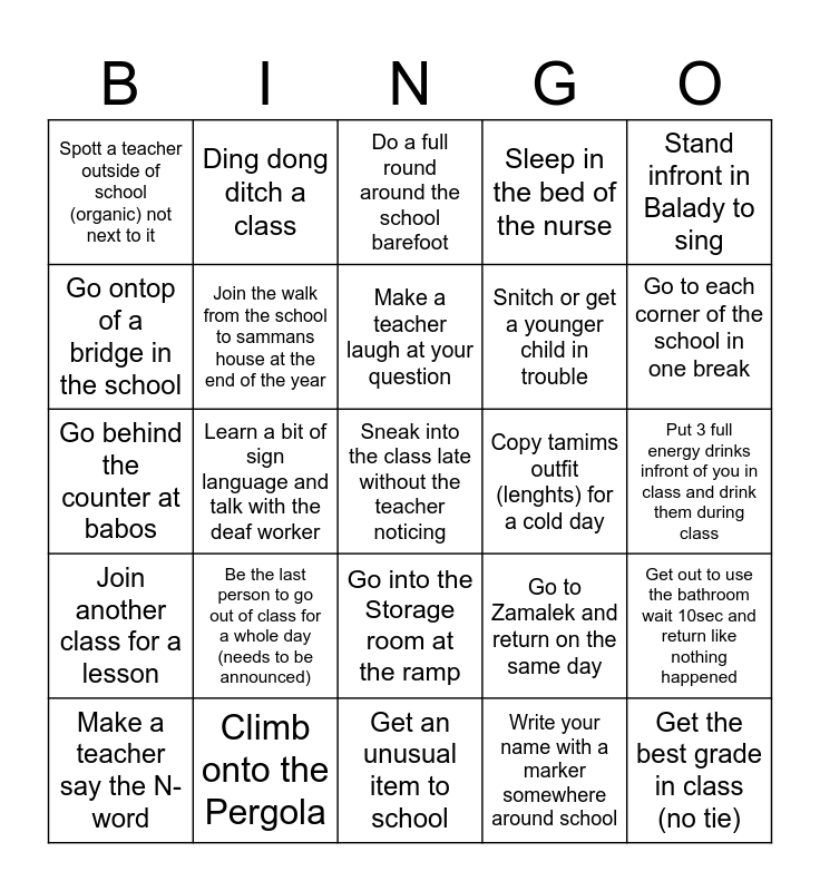 This bingo card has a free space and 24 words: Be the last person to go out of class for a whole day (needs to be announced), Climb onto the Pergola, Make a teacher laugh at your question, Make a teacher say the N-word, Stand infront in Balady to sing, Spott a teacher outside of school (organic) not next to it, Go ontop of a bridge in the school, Ding dong ditch a class, Copy tamims outfit (lenghts) for a cold day, Go into the Storage room at the ramp, Snitch or get a younger child in trouble, Go behind the counter at babos, Go to Zamalek and return on the same day, Get out to use the bathroom wait 10sec and return like nothing happened, Join the walk from the school to sammans house at the end of the year, Write your name with a marker somewhere around school, Put 3 full energy drinks infront of you in class and drink them during class, Do a full round around the school barefoot, Go to each corner of the school in one break, Learn a bit of sign language and talk with the deaf worker, Get the best grade in class (no tie), Join another class for a lesson, Sleep in the bed of the nurse and Get an unusual item to school.