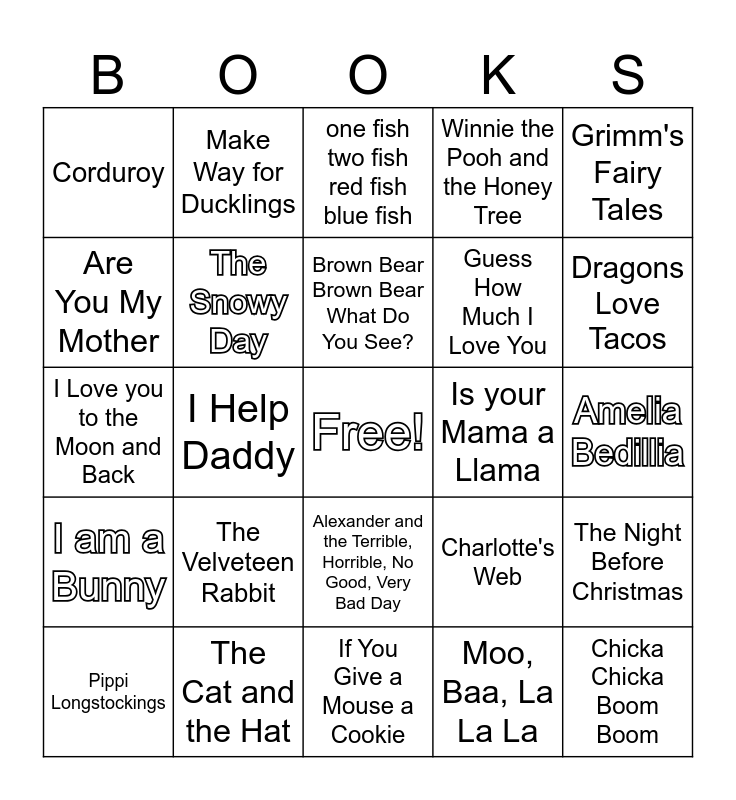 This bingo card has a free space and 44 words: Clifford the Big Red Dog, Chicka Chicka Boom Boom, Stone Soup, Pippi Longstockings, Goodnight Moon, Moo, Baa, La La La, one fish two fish red fish blue fish, The Lorax, Grimm's Fairy Tales, The Cat and the Hat, Winnie the Pooh and the Honey Tree, Is your Mama a Llama, Alexander and the Terrible, Horrible, No Good, Very Bad Day, The Velveteen Rabbit, The Giving Tree, If You Give a Mouse a Cookie, The Rainbow Fish, I Love you to the Moon and Back, Harold and the Purple Crayon, Dragons Love Tacos, Make Way for Ducklings, The Tale of Peter Rabbit, Pat the Bunny, Corduroy, Story of Ferdinand, Amelia Bedillia, Curious George, The Little Prince, Charlotte's Web, I am a Bunny, Mike Mulligan and His Steam Shovel, The Night Before Christmas, The Pokey Little Puppy, The Carrot Seed, I Help Daddy, Caps for Sale, The Very Hungry Caterpillar, The Little Engine that Could, Brown Bear Brown Bear What Do You See?, Are You My Mother, Guess How Much I Love You, Green Eggs and Ham, The Snowy Day and Where the Wild Things Are.