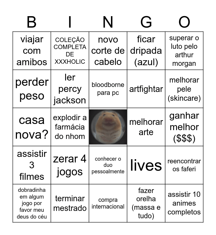 This bingo card has a free space and 24 words: zerar 4 jogos, terminar mestrado, bloodborne para pc, dobradinha em algum jogo por favor meu deus do céu, superar o luto pelo arthur morgan, viajar com amibos, perder peso, COLEÇÃO COMPLETA DE XXXHOLIC, melhorar arte, conhecer o duo pessoalmente, artfightar, casa nova?, lives, reencontrar os faferi, ler percy jackson, fazer orelha (massa e tudo), ganhar melhor ($$$), novo corte de cabelo, melhorar pele (skincare), explodir a farmácia do nhom, assistir 10 animes completos, assistir 3 filmes, ficar dripada (azul) and compra internacional.