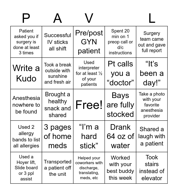This bingo card has a free space and 24 words: 3 pages of home meds, Transported a patient off the unit, Used interpreter for at least ½ of your patients, Used a Hoyer lift, Slide board or 3 ppl assist, Surgery team came out and gave full report, Patient asked you if surgery is done at least 3 times, Write a Kudo, Successful IV sticks all shift, Bays are fully stocked, “I’m a hard stick”, Pt calls you a “doctor”, Anesthesia nowhere to be found, Drank 64 oz of water, Shared a laugh with a patient, Took a break outside with sunshine and fresh air, Worked with your best buddy this week, Take a photo with your favorite anesthesia provider, Pre/post GYN patient, “It’s been a day!”, Brought a healthy snack and shared, Took stairs instead of elevator, Used 2 allergy bands to list all allergies, Spent 20 min on 1 preop call or d/c instructions and Helped your coworkers with discharge, translating, meds, etc.