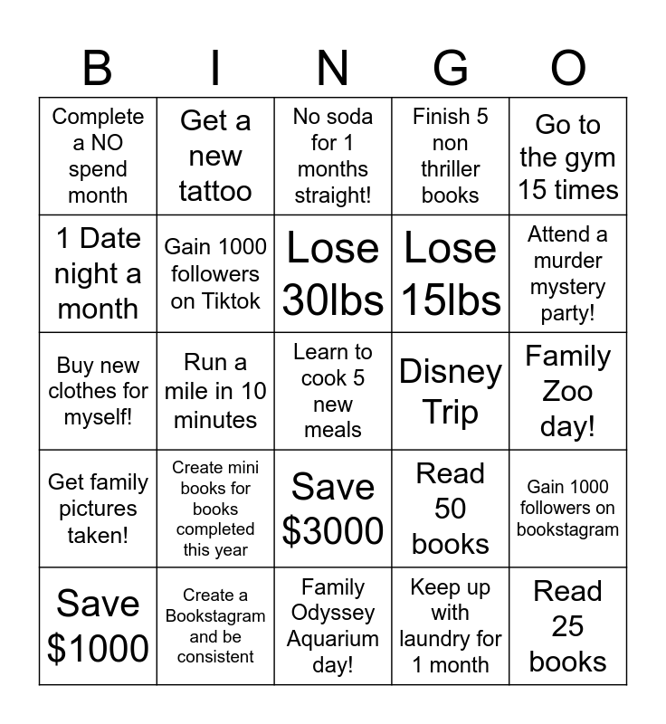 This bingo card has a free space and 24 words: Create mini books for books completed this year, Create a Bookstagram and be consistent, Lose 30lbs, Save $1000, Go to the gym 15 times, Complete a NO spend month, 1 Date night a month, Get a new tattoo, Disney Trip, Save $3000, Lose 15lbs, Buy new clothes for myself!, Read 50 books, Gain 1000 followers on bookstagram, Gain 1000 followers on Tiktok, Keep up with laundry for 1 month, Family Zoo day!, No soda for 1 months straight!, Attend a murder mystery party!, Run a mile in 10 minutes, Read 25 books, Get family pictures taken!, Finish 5 non thriller books and Family Odyssey Aquarium day!.