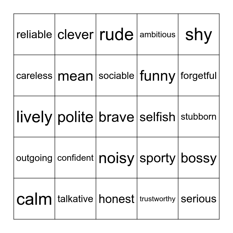 This bingo card has 25 words: confident, honest, sociable, calm, shy, reliable, careless, clever, selfish, noisy, funny, lively, sporty, bossy, mean, serious, stubborn, rude, forgetful, polite, brave, talkative, outgoing, ambitious and trustworthy.