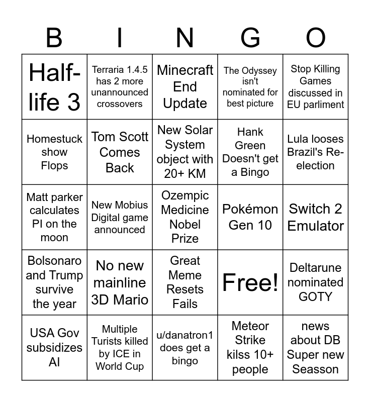 This bingo card has 25 words: No new mainline 3D Mario, u/danatron1 does get a bingo, New Solar System object with 20+ KM, USA Gov subsidizes AI, Stop Killing Games discussed in EU parliment, Half-life 3, Homestuck show Flops, Terraria 1.4.5 has 2 more unannounced crossovers, Pokémon Gen 10, Great Meme Resets Fails, Hank Green Doesn't get a Bingo, Matt parker calculates PI on the moon, Free!, Deltarune nominated GOTY, Tom Scott Comes Back, news about DB Super new Seasson, Switch 2 Emulator, Minecraft End Update, Lula looses Brazil's Re-election, New Mobius Digital game announced, Ozempic Medicine Nobel Prize, Multiple Turists killed by ICE in World Cup, Bolsonaro and Trump survive the year, The Odyssey isn't nominated for best picture and Meteor Strike kilss 10+ people.