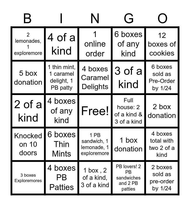 This bingo card has a free space and 24 words: 6 boxes Thin Mints, 4 boxes PB Patties, 4 boxes Caramel Delights, 3 boxes Exploremores, 12 boxes of cookies, 2 lemonades, 1 exploremore, 5 box donation, 4 of a kind, Full house: 2 of a kind & 3 of a kind, 1 PB sandwich, 1 lemonade, 1 exploremore, 3 of a kind, 2 of a kind, 1 box donation, 4 boxes total with two 2 of a kind, 1 thin mint, 1 caramel delight, 1 PB patty, PB lovers! 2 PB sandwiches and 2 PB patties, 2 box donation, 1 online order, 6 boxes sold as Pre-Order by 1/24, 4 boxes of any kind, 2 boxes sold as pre-order by 1/24, Knocked on 10 doors, 6 boxes of any kind and 1 box , 2 of a kind, 3 of a kind.
