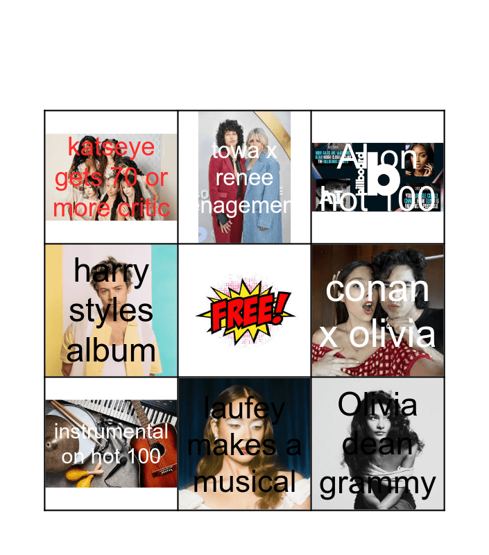 This bingo card has 8 images, a free space and 8 words: conan x olivia, AI on hot 100, towa x renee enagement, instrumental on hot 100, katseye gets 70 or more critic, Olivia dean grammy, harry styles album and laufey makes a musical.