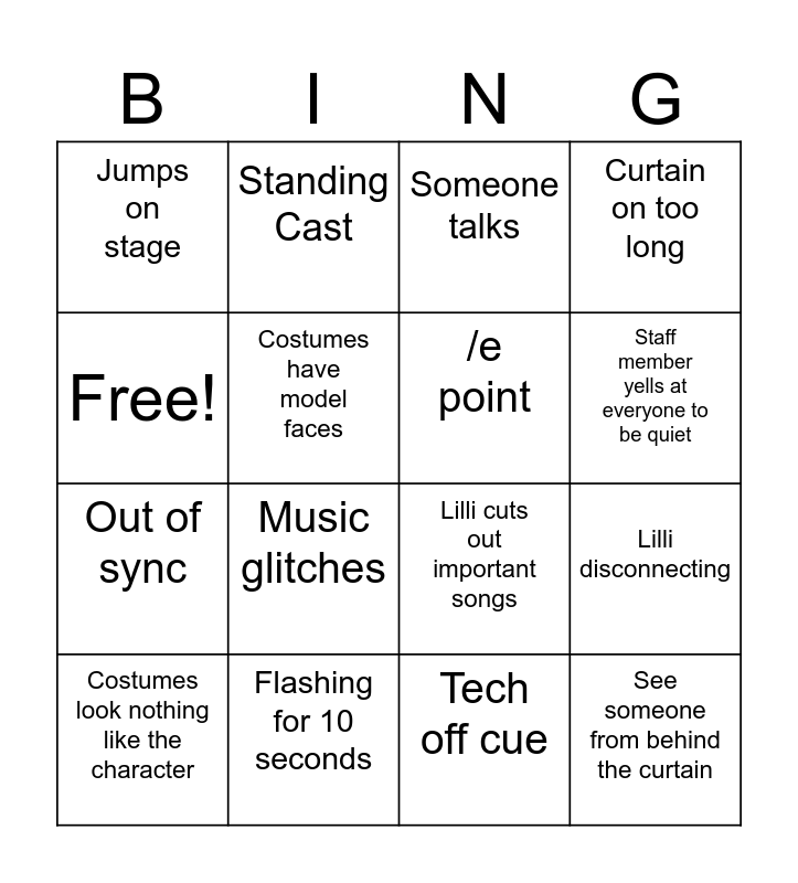 This bingo card has 16 words: Flashing for 10 seconds, Lilli disconnecting, Someone talks, Jumps on stage, Out of sync, Standing Cast, Lilli cuts out important songs, Tech off cue, Free!, Costumes have model faces, Costumes look nothing like the character, Curtain on too long, Music glitches, Staff member yells at everyone to be quiet, /e point and See someone from behind the curtain.