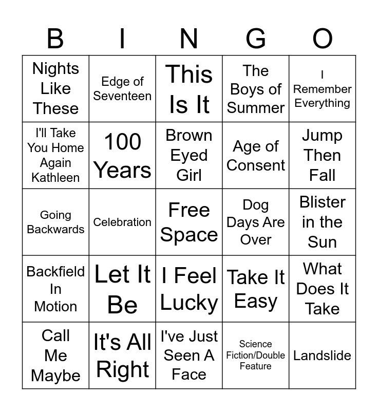 This bingo card has a free space and 75 words: Piano Man, Adventure of a Lifetime, This Is It, Windmills of Your Mind, I Want to Know What Love Is, Hallelujah, Dancing in the Moonlight, mirrorball, To Sir With Love, Jack & Diane, Half of my Hometown, Spirit in the Sky, Brown Eyed Girl, I'll Take You Home Again Kathleen, Woman, Celebration, Over the Rainbow, Landslide, Wild World, I Remember Everything, Sarah's Place, Going Backwards, 100 Years, Edge of Seventeen, The Boys of Summer, Leather and Lace, Mexico, I feel the Earth Move, Will The Circle Be Unbroken, Babel, Hotel California, Me and Julio Down by the Schoolyard, Ramblin' Man, Take It Easy, Jump Then Fall, Age of Consent, Just A Little While, False Confidence, Blister in the Sun, Science Fiction/Double Feature, Love My Way, Born A Woman, You Can Leave Your Hat On, Long Live, Borderline, Party in the USA, Call Me Maybe, Nights Like These, Moments We Live For, I Wanna Remember, Take A Chance On Me, I Feel Lucky, You Are the Best Thing, Choosin' Texas, Brown Eyed Women, Evil Ways, God Only Knows, I Say A Little Prayer, Send My Love, lover's carvings, Let It Be, Your Song, Scenes From An Italian Restaurant, Running Up That Hill, It's All Coming Back to Me Now, Dog Days Are Over, Somewhere Only We Know, Back 2 Good, Wise Up, What Does It Take, Backfield In Motion, It's All Right, Least Complicated, I've Just Seen A Face and Don't Go Breaking My Heart.