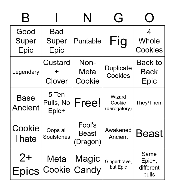 This bingo card has a free space and 24 words: Oops all Soulstones, Meta Cookie, Non-Meta Cookie, 2+ Epics, 4 Whole Cookies, Good Super Epic, Legendary, Bad Super Epic, Wizard Cookie (derogatory), Fool's Beast (Dragon), Duplicate Cookies, Base Ancient, Awakened Ancient, Beast, Custard + Clover, Gingerbrave, but Epic, They/Them, Puntable, Back to Back Epic, 5 Ten Pulls, No Epic+, Same Epic+, different pulls, Cookie I hate, Fig and Magic Candy.