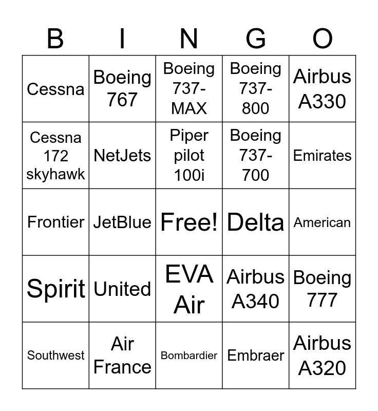 This bingo card has a free space and 24 words: United, Air France, Piper pilot 100i, Southwest, Airbus A330, Cessna, Cessna 172 skyhawk, Boeing 767, Delta, EVA Air, Boeing 737-700, Frontier, Airbus A340, Boeing 777, NetJets, Embraer, American, Boeing 737- MAX, Emirates, JetBlue, Airbus A320, Spirit, Boeing 737-800 and Bombardier.